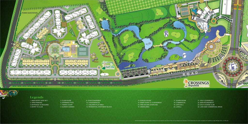 Secured Township Entrance Gate Grand plaza Wide 6 & 4 Lane Township Roads Grand Central Plaza with fountains, subway and shopping centre Golf course with lake and lake side food courts. Arterial and Central Landscape Greens Cycling Track Jogging Track Hospitals Schools Police and Fire Station CNG Station PNG supply 24hrs water supply Sector Level club with swimming pool and Gymnasium Kids play area Senior Citizen sitting lounge Neighborhood market Power backup Tennis and Badminton courts Three tier Security – CCTV at Township Gate, Security guards at Sector Entrance and at Tower Entrance